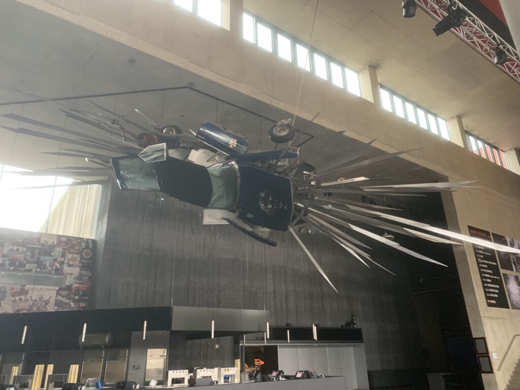 That is a car hanging from the ceiling, upside down and filled with steel blades.