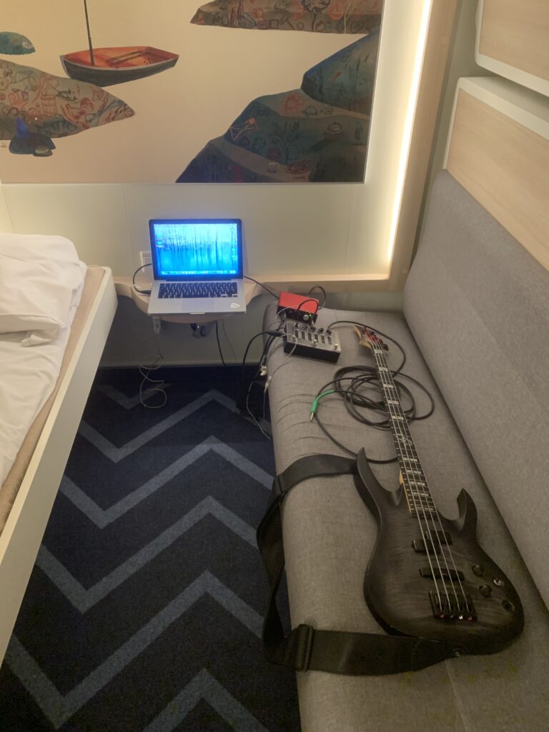 Woke up at around 7:00 to get on the ferry to Stockholm. Once on the boat, I set up my portable ”studio”. Thought I’d get some recording done today. However, I didn’t realise that my strings were totally dead. In fact, I could hardly tell what the notes were on the lowest string – that’s how dead they were. I don’t have any strings with me in the cabin, they’re all on the bus. So no recording today. String change first.